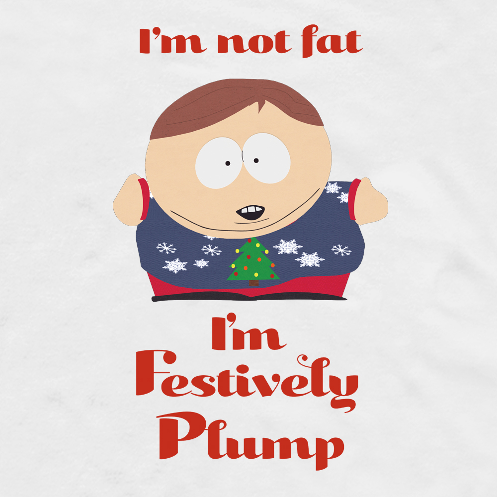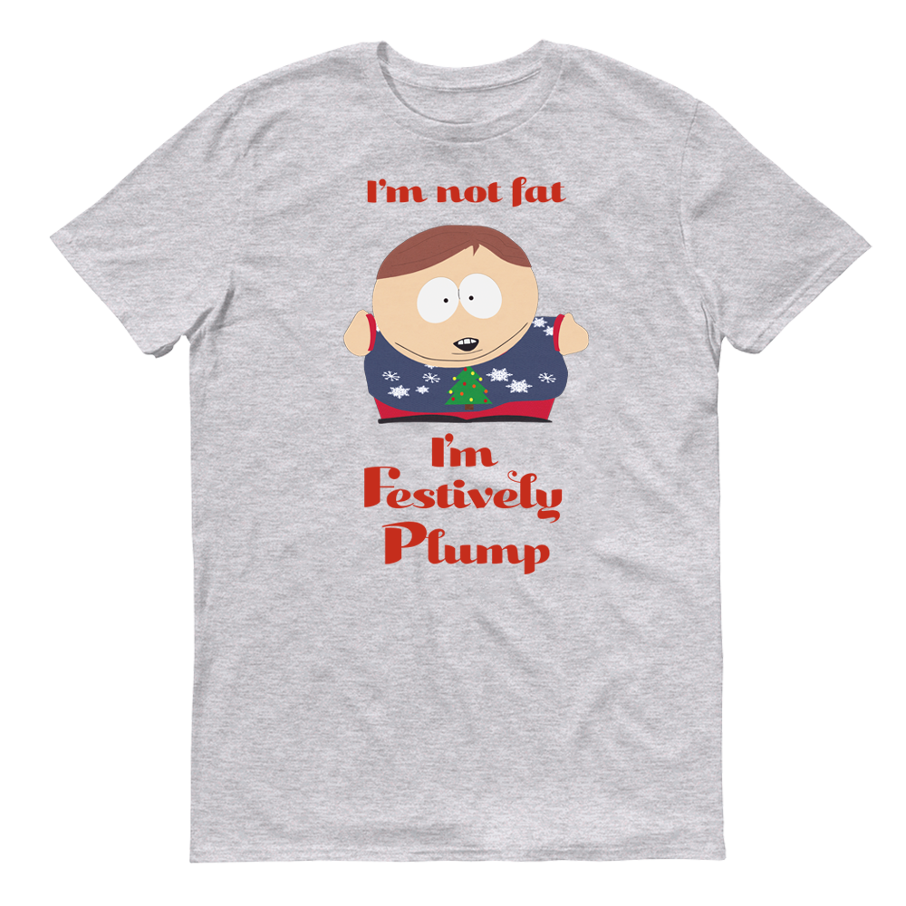 Get festively and stylishly plump with this South Park Festively Plump Adult Short Sleeve T-Shirt. Perfect for the holiday season, this comfy tee reminds everyone that you are not fat, just festively plump like Eric Cartman.