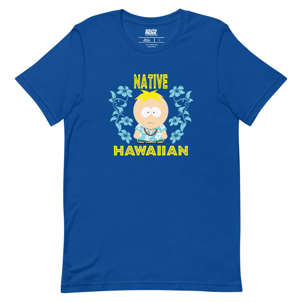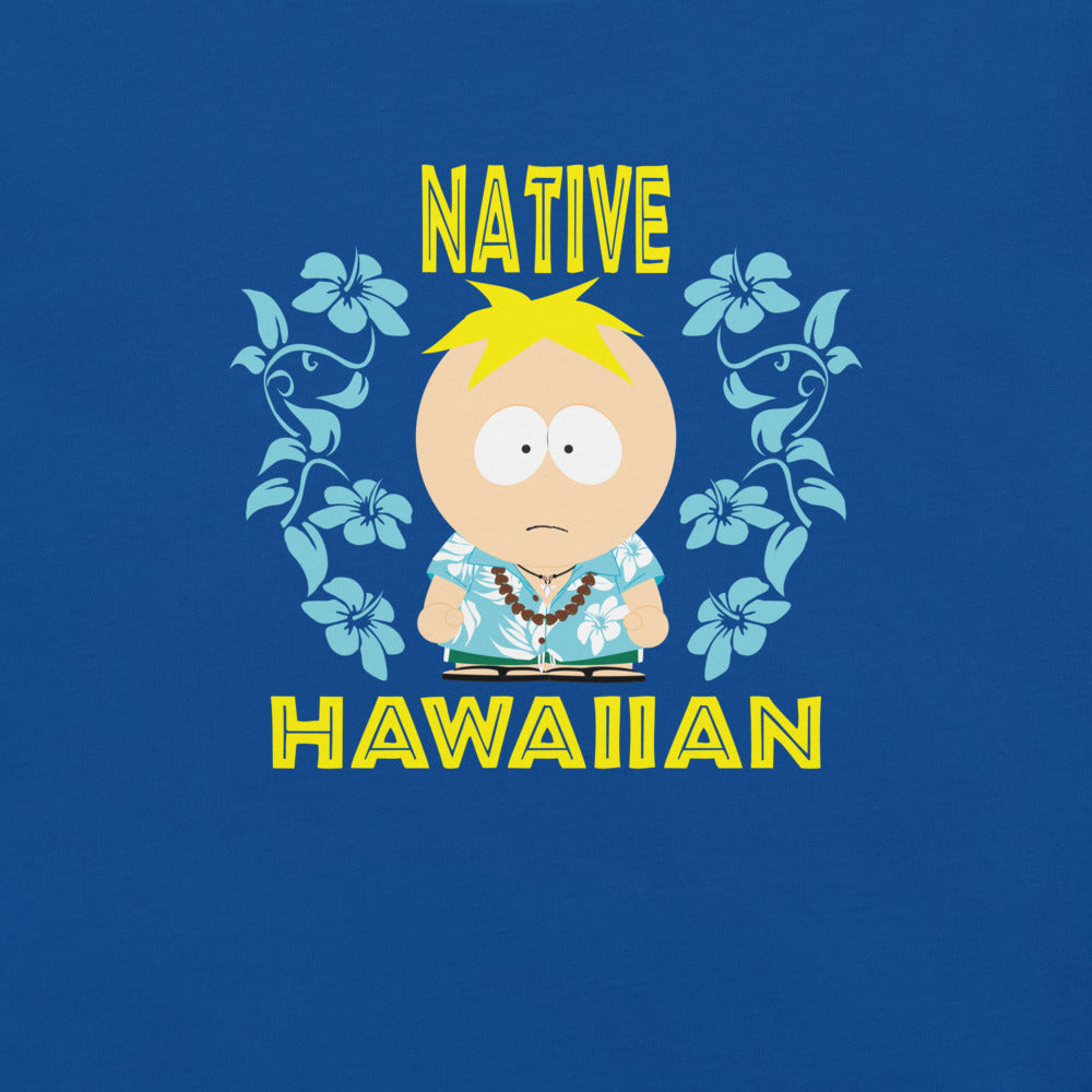 Embrace the sunny side of South Park with the South Park Butters Native Hawaiian Unisex T-Shirt! This vibrant T-shirt features Butters Stotch in a fun, Hawaiian-themed adventure, complete with palm trees, tiki torches, and colorful leis.