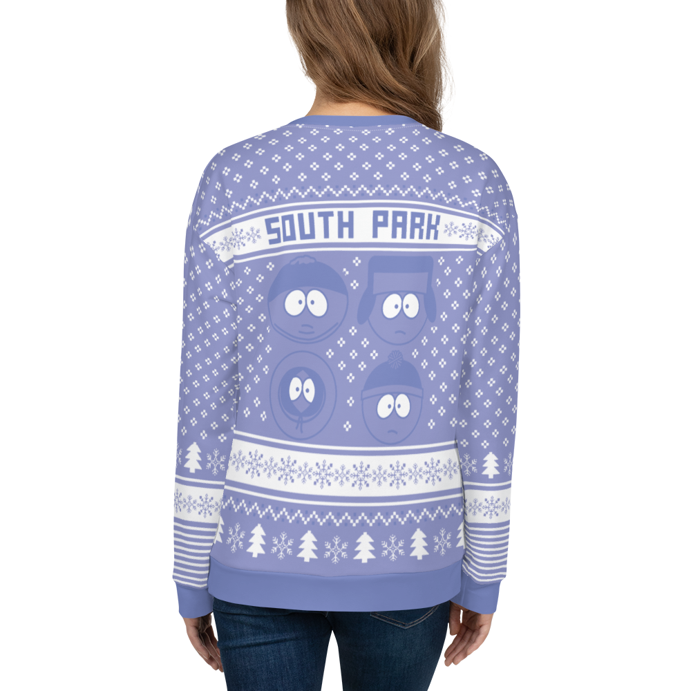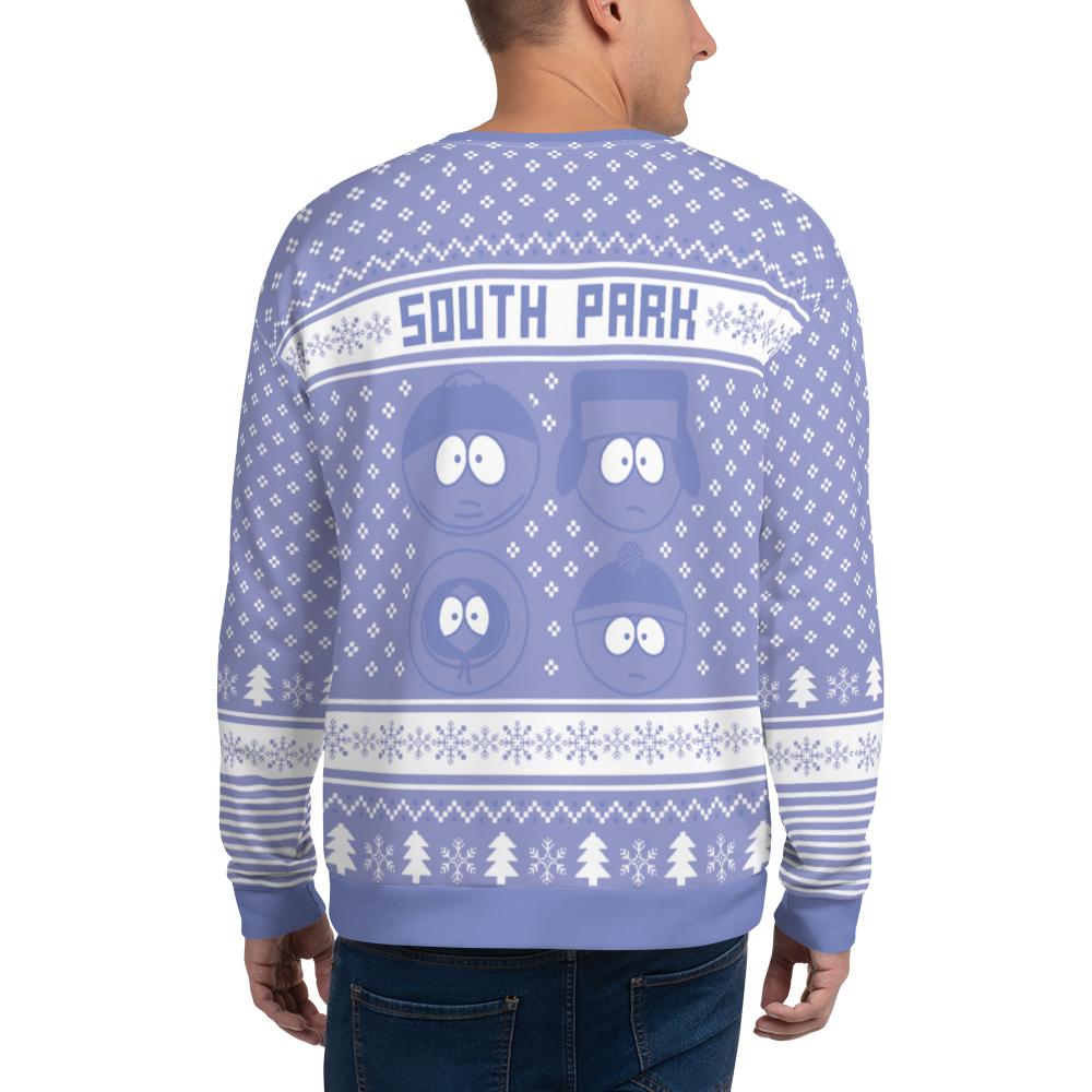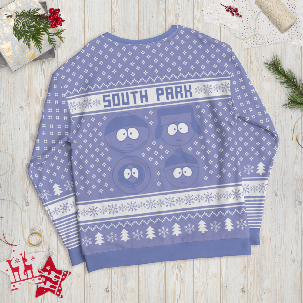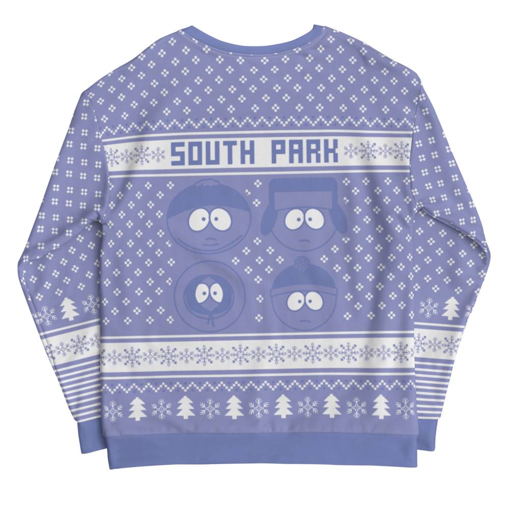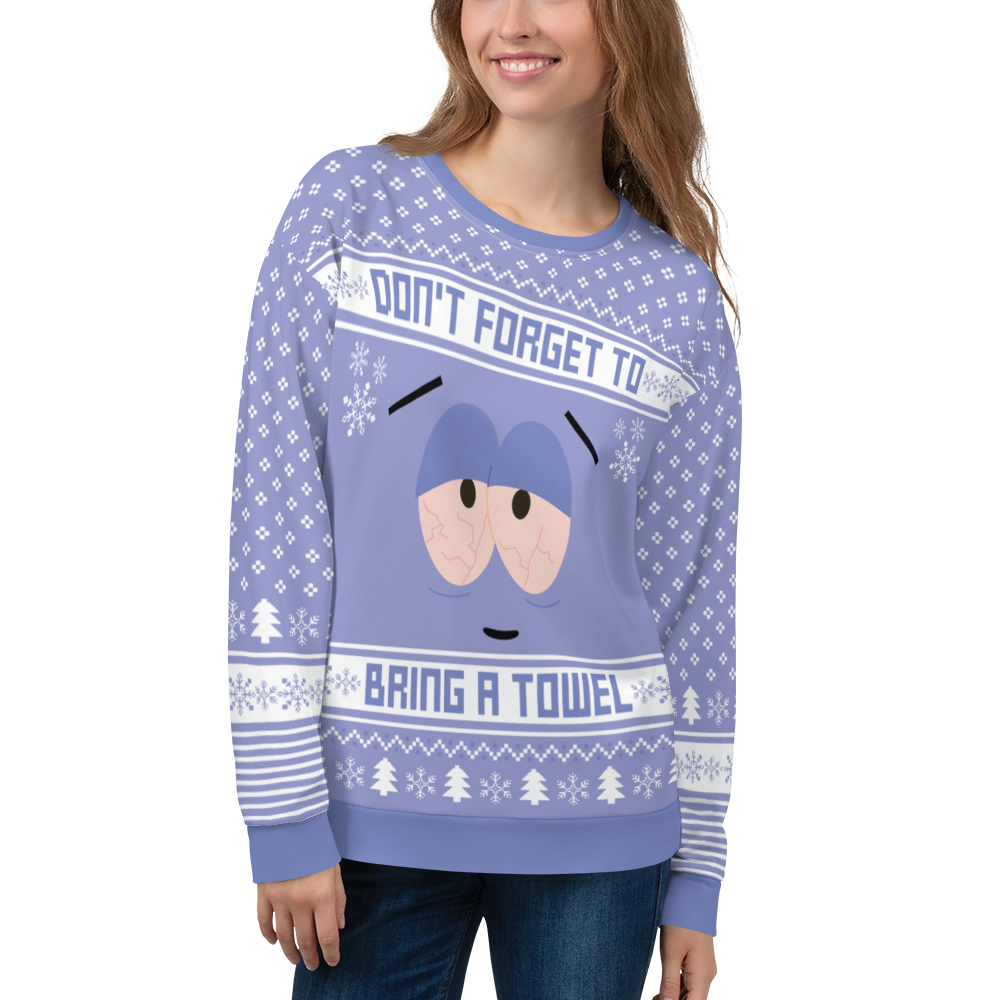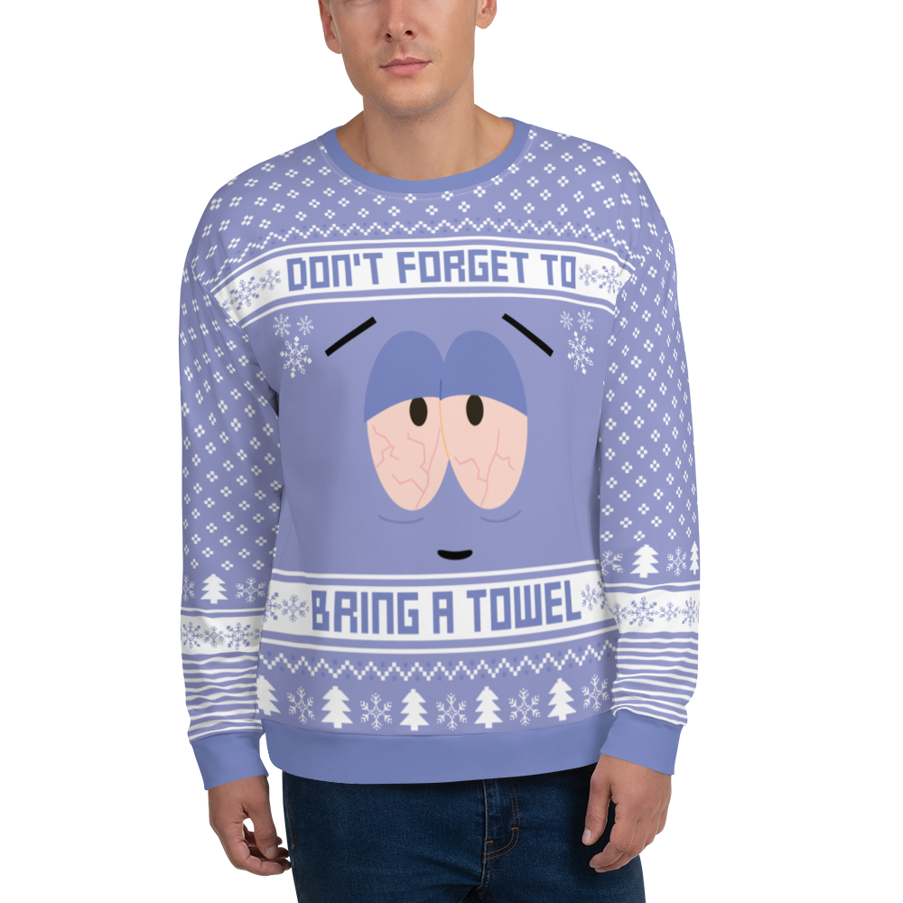 No matter where you roam this holiday season, you must remember one thing: never forget to bring a towel. With an all-over print design, this sweatshirt features Towelie on the front and Cartman, Kyle, Stan, and Kenny on the back. This comfortable South Park Towelie Ugly Holiday Sweatshirt is perfect to wear as you sing carols, decorate your home, or bake some special holiday brownies. This sweatshirt also makes a great gift for the biggest South Park fans.