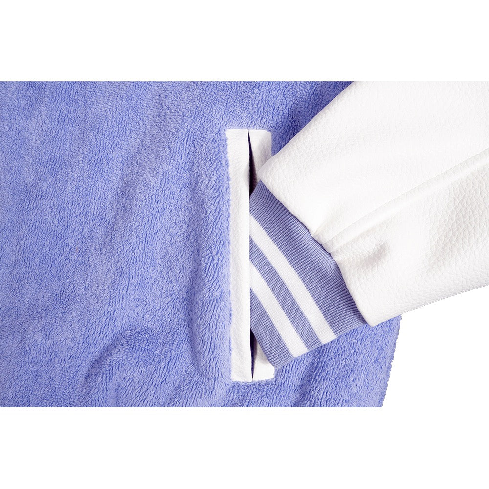 - Terry Fabric Body and PU Leather (vegan) sleeves with leather pocket trim.